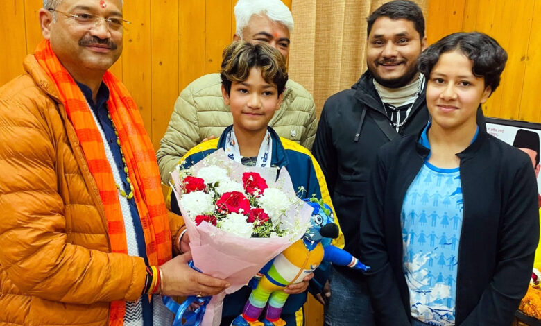 देहरादून, 02 मार्च। आज नगर निगम देहरादून स्थित मेयर कार्यालय में 13वें मॉर्डन पेंटाथलॉन नेशनल में अंडर -13 आयु वर्ग में ट्रायथल व बायथल में स्वर्ण पदक विजेता व पेंटाथलॉन में उत्तराखण्ड की सबसे कम उम्र की खिलाड़ी आरना चौहान ने मेयर सौरभ थपलियाल से शिष्टाचार मुलाकात की। आरना चौहान ने फरवरी माह में हल्द्वानी में आयोजित प्रतियोगिता में टीम स्पर्धा में रजत पदक जीता। इस अवसर पर मेयर सौरभ थपलियाल ने आरना चौहान को पुष्पगुच्छ से सम्मानित कर उनके उज्ज्वल भविष्य व मंगलमय जीवन की कामना की।