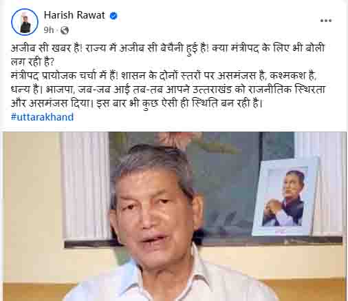 देहरादून। उत्तराखंड में कैबिनेट विस्तार की चर्चाएं जन्म ले रहीं हैं। सत्ता के गलियारे में चर्चा हो रहीं हैं की बहुत जल्द कैबिनेट विस्तार होने जा रहा हैं। इन चर्चाओं मे कितनी सच्चाई हैं, यह तो आने वाला वक्त ही बतायेगा, लेकिन इतना जरूर हैं की कैबिनेट विस्तार के संबंध में उत्तराखंड राज्य के पूर्व मुख्यमंत्री हरीश रावत की फेसबूक एकाउंट में की गई एक पोस्ट ने राजनीति में भूचाल ला दिया हैं और अनेक सवालों को जन्म दे दिया हैं।