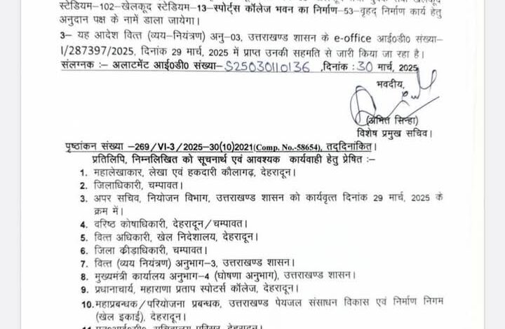 देहरादून। कैबिनेट मंत्री श्रीमती रेखा आर्य ने बताया कि नवरात्रि के शुभ अवसर पर प्रदेश की देवी स्वरुप बालिकाओं के लिए बड़ी सौगात दी जा रही है। राज्य सरकार खेल के क्षेत्र में बालिकाओं, महिलाओं को सशक्त बनाने की ओर महत्व पूर्ण कदम आगे बढ़ा रही हैं। उन्होंने कहा कि जनपद-चम्पावत के अन्तर्गत प्रदेश की बालिका, महिला खिलाड़ियों के खेल कौशल विकास हेतु जनपद- चम्पावत में महिला स्पोर्ट्स कॉलेज स्थापित किया जाना है। जिसके निर्माण कार्य हेतु वित्तीय वर्ष 2024-25 में उक्त के सापेक्ष वित्त विभाग द्वारा कार्य पूर्ति एवं कियान्वयन किये जाने के लिए सुसंगत मद में बजट की उपलब्धता के आधार पर कुल बजट लगभग 256 करोड़ के सापेक्ष प्रथम किश्त के रूप में रू. 5.15 लाख (रू. पांच लाख पन्द्रह हजार मात्र) अवमुक्त कर व्यय करने की राज्यपाल महोदय द्वारा सहर्ष स्वीकृति प्रदान की गई है। कैबिनेट मंत्री ने प्रदेश के सभी बालिका, महिला खिलाड़ियों को बधाई देते हुए उनके उज्ज्वल भविष्य की शुभकामना दी और मुख्यमंत्री का आभार व्यक्त किया।
