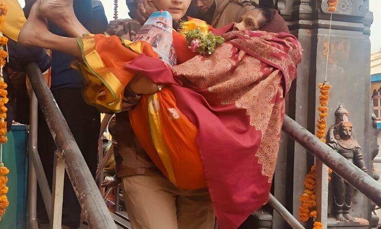 बुजुर्ग माँ को गोदी में उठाकर मंदिर के मुख्य द्वार तक ले गईं और उन्हें सुगमता से दर्शन करवाए।