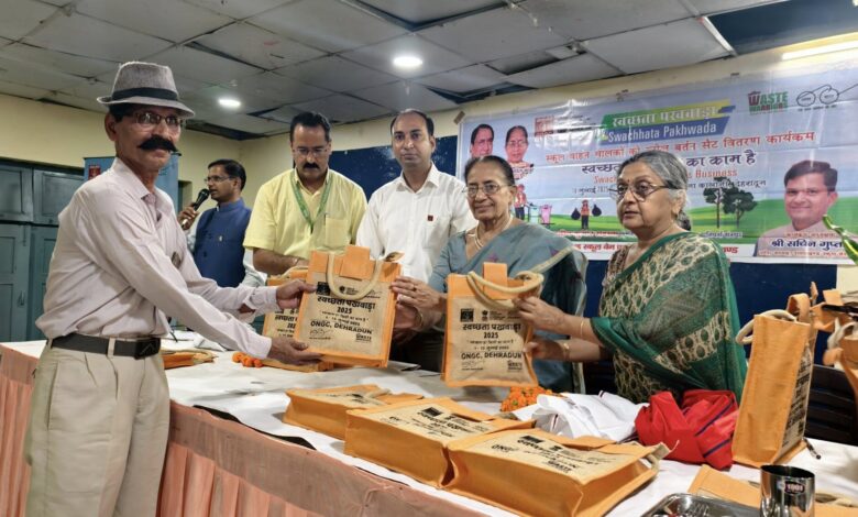 देहरादून,10 जुलाई। तेल एवं प्राकृतिक गैस निगम लिमिटेड द्वारा आयोजित स्वच्छता पखवाड़ा कार्यक्रम के अंतर्गत आज एक विशेष आयोजन किया गया। जिसमें देहरादून जिले के स्कूली वाहन चालकों को स्टील बर्तन सेट (कटलरी) वितरित किए गए। देहरादून जिले में कार्यरत लगभग 300 स्कूली ऑटो, वैन एवं बस चालकों को सिंगल यूज प्लास्टिक के स्थान पर पर्यावरण अनुकूल बर्तनों के उपयोग हेतु प्रोत्साहित करते हुए, स्टील की प्लेट, कटोरी, चम्मच, ग्लास, कांटा और स्ट्रॉ सहित एक संपूर्ण कटलरी सेट एक जूट बैग में प्रदान किया गया। यह प्रयास स्वच्छता, सतत जीवनशैली और पर्यावरण संरक्षण की दिशा में एक सराहनीय पहल है। कार्यक्रम के मुख्य अतिथि डॉ. नरेश बंसल, सांसद राज्यसभा ने कार्यक्रम का शुभारंभ कियाI नरेश बंसल ने कहा कि आज देश के प्रधानमंत्री नरेंद्र मोदी स्वच्छता को लेकर देश में विशेष योजनाए अभियान चला रहे है, परंतु स्वच्छता योजनाए तभी सफल होगी जब आम जनमानस अपनी जिम्मेदारियां के साथ इस अभियान से जुड़ेंगेI कार्यक्रम में ओएनजीसी के वरिष्ठ अधिकारी अरुण सिंह, वेस्ट वॉरियर्स संस्था के सहायक निदेशक नवीन कुमार सडाना, सचिन गुप्ता आदि उपस्थित रहे।