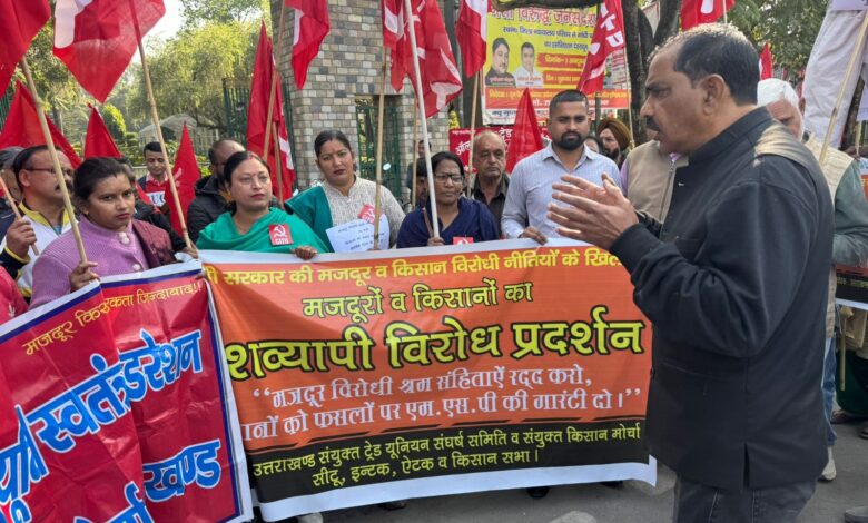 देहरादून 26 नवंबर। श्रम सहिताओं के विरोध व एम एस पी कि गारंटी को लेकर उत्तराखंड संयुक्त ट्रेड यूनियन संघर्ष समिति व संयुक्त किसान मौर्चा ने गाँधी पार्क पर एकत्रित हो कर का विरोध प्रदर्शन कर प्रधानमंत्री का पुतला फूंका। आज सीटू, ऐटक, इंटक उत्तराखण्ड किसान सभा ने संयुक्त रूप से प्रदर्शन किया इस अवसर पर सीटू व किसान सभा ने सीटू कार्यालय से जलूस के रूप मे गाँधी पार्क पहुंचे व वहाँ मौजूद ऐटक इंटक के साथ मिल कर विरोध नारेबाजी करते हुए जन सभा की।