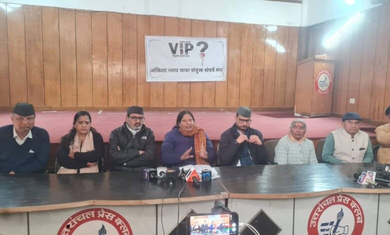 देहरादून, 08 जनवरी। अंकिता भंडारी हत्याकांड में कथित ‘वीआईपी’ हस्तियों की जांच और गिरफ्तारी की मांग को लेकर गठित “अंकिता न्याय यात्रा संयुक्त संघर्ष मंच” ने 11 जनवरी को “उत्तराखंड बंद” का आह्वान किया। आज दोपहर 12 बजे प्रेस क्लब देहरादून में आयोजित प्रेस कॉन्फ्रेंस मे मंच के नेताओं ने आरोप लगाया कि सरकार जांच में पारदर्शिता नहीं बरत रही है और ‘वीआईपी’ को बचाने की कोशिश हो रही है।