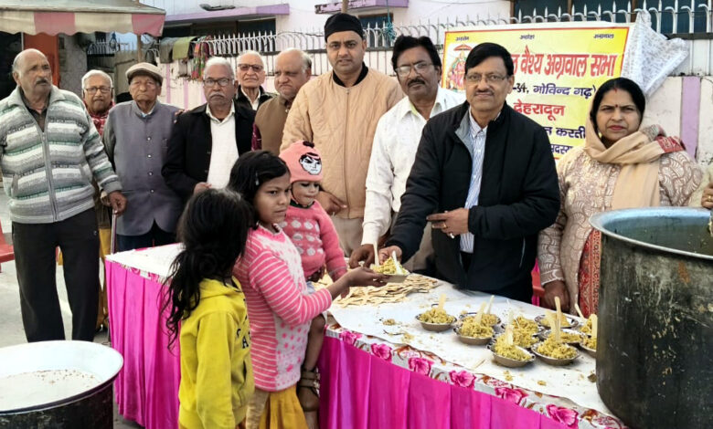देहरादून। उत्तरांचल वैश्य अग्रवाल सभा, गोविंदगढ़ देहरादून द्वारा मकर संक्रांति के पावन अवसर पर 20वां खिचड़ी वितरण कार्यक्रम श्रद्धा, सेवा और सामाजिक समरसता के भाव के साथ आयोजित किया गया। कार्यक्रम में क्षेत्र के लोगों ने बढ़-चढ़कर सहभागिता की और खिचड़ी प्रसाद ग्रहण किया। इस अवसर पर सभा के उत्तरांचल महासभा के अध्यक्ष शशांक गुप्ता पदाधिकारियों एवं सदस्यों ने बच्चों, महिलाओं, बुजुर्गों एवं राहगीरों को खिचड़ी वितरित की। कार्यक्रम का उद्देश्य समाज में आपसी भाईचारे को मजबूत करना तथा जरूरतमंदों तक सेवा पहुँचाना रहा।