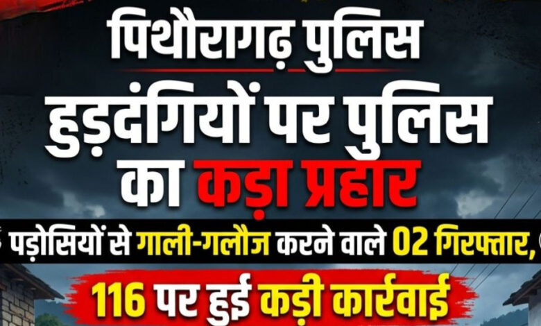 पिथौरागढ़। जनपद में शांति एवं कानून व्यवस्था बनाए रखने हेतु पिथौरागढ़ पुलिस द्वारा लगातार अभियान चलाया जा रहा है। इसी क्रम में कोतवाली पिथौरागढ़ पुलिस ने उत्पात मचाने वाले दो व्यक्तियों को गिरफ्तार किया है, जबकि जिले भर में यातायात और सार्वजनिक मर्यादा भंग करने वाले 116 लोगों के विरुद्ध कार्रवाई की गई है। कुमौड़ क्षेत्र में पड़ोसियों के साथ गाली-गलौज कर उत्पात मचाने की सूचना पर कोतवाली पिथौरागढ़ के हेड कांस्टेबल मुकेश चन्द्र शर्मा अपनी टीम के साथ मौके पर पहुँचे। पुलिस टीम द्वारा काफी समझाने के बावजूद भी उक्त व्यक्ति शांत नहीं हुए और हंगामा जारी रखा। सार्वजनिक शांति भंग करने और पुलिस के निर्देशों की अवहेलना करने पर दीपक सिंह दिगारी और भुवन गहतोड़ी (निवासी कुमौड़) को धारा 172 बीएनएस के तहत हिरासत में लिया गया। पिथौरागढ़ पुलिस ने स्पष्ट किया है कि जनपद में हुड़दंग करने वाले और कानून हाथ में लेने वाले तत्वों को किसी भी सूरत में बख्शा नहीं जाएगा।