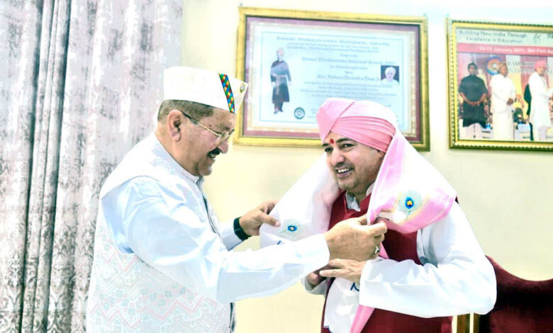 देहरादून। खादी एवं ग्रामोद्योग तथा ग्राम्य विकास मंत्री भरत चौधरी ने श्री दरबार साहिब पहुंचकर मत्था टेका और देश-प्रदेश की खुशहाली की कामना की। इस अवसर पर उन्होंने श्री दरबार साहिब के सज्जादे गद्दी नशीन एवं श्री गुरु राम राय विश्वविद्यालय के प्रेसीडेंट श्रीमहंत देवेन्द्र दास महाराज से शिष्टाचार भेंट कर आशीर्वाद प्राप्त किया। कैबिनेट मंत्री बनने के बाद पहली बार श्री दरबार साहिब पहुंचे भरत चौधरी का परंपरानुसार भव्य स्वागत किया गया। श्रीमहंत देवेन्द्र दास महाराज ने उन्हें श्री दरबार साहिब का स्मृति चिन्ह भेंट कर सम्मानित किया। दोनों के बीच उत्तराखण्ड के समसामयिक विषयों पर विस्तारपूर्वक चर्चा हुई।